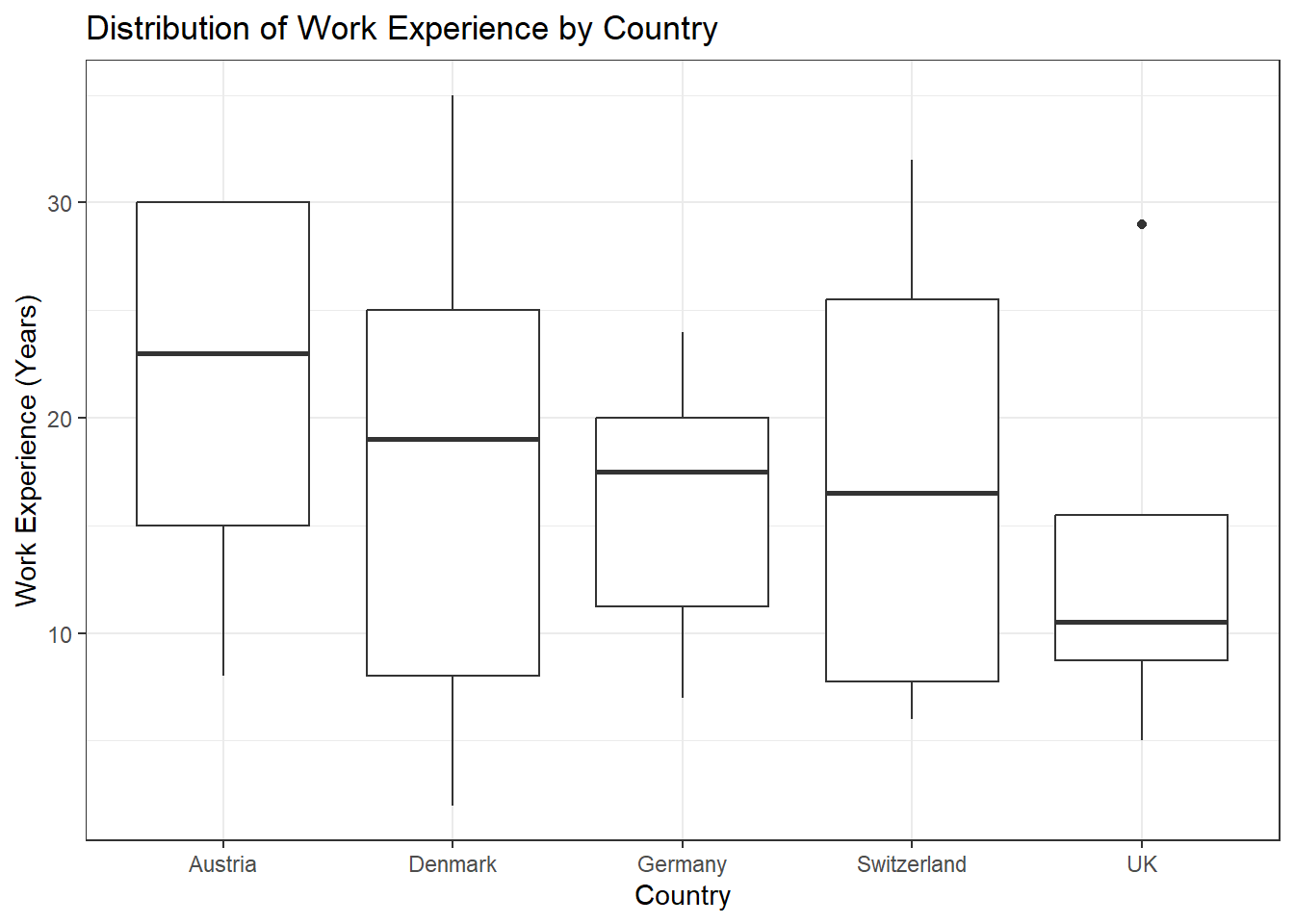 Now, create a box plot to visualize the distribution of work experience in years for each country in the dataset: