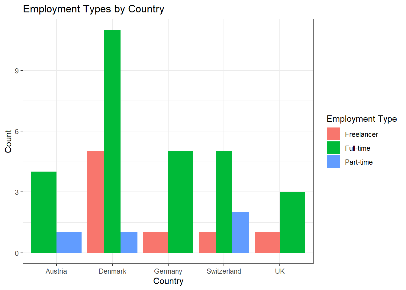 Next, try to recreate this bar plot. Use geom_bar(position = "dodge") to create it. dodgeproduces the graph below whereas geom_bar(position = "stack") will create a stacked bar chart.