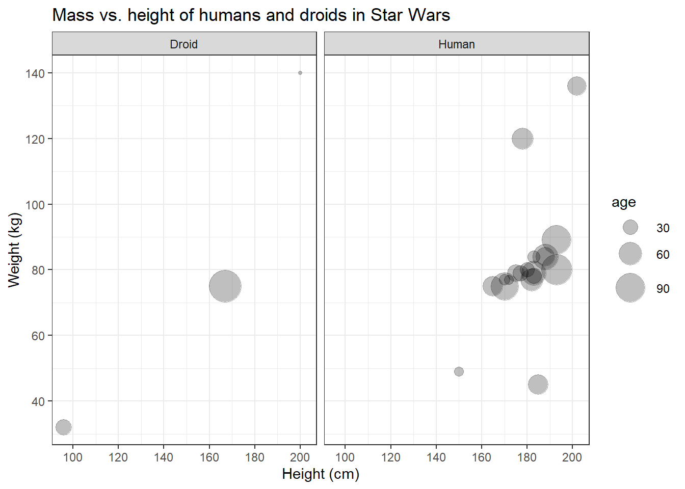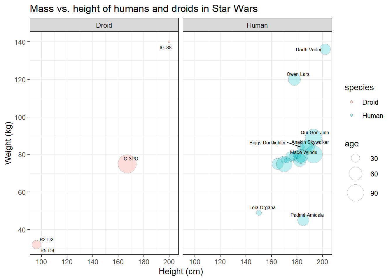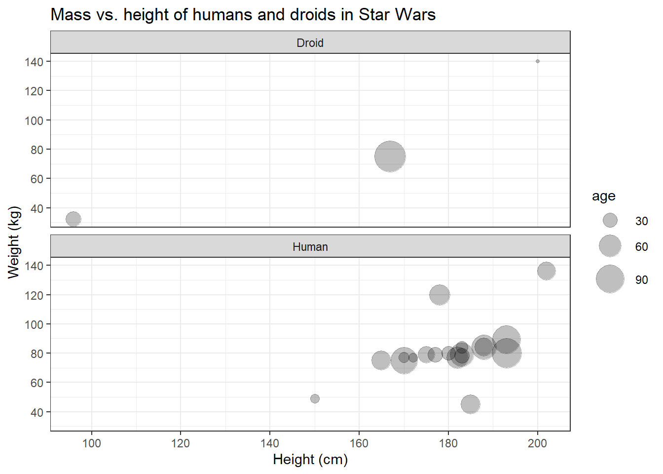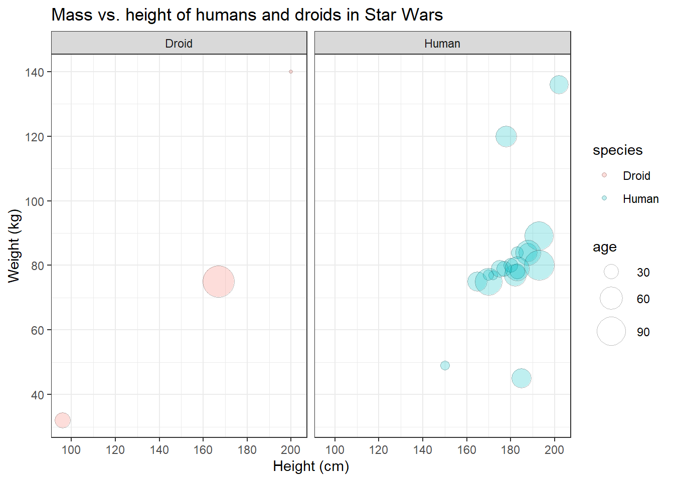 Great, finally we can distinguish the data points representing humans from those representing droids! On the left side, however, the panel with the humans looks a bit empty. Maybe we should put them next to each other.