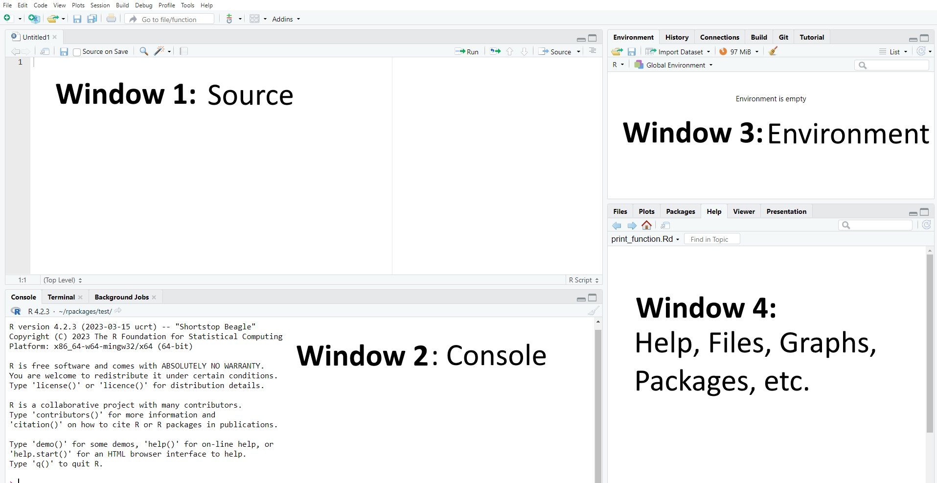 - Visualizing data, searching for help, updating packages etc. (Window 4: Files/Plots/Packages etc.)