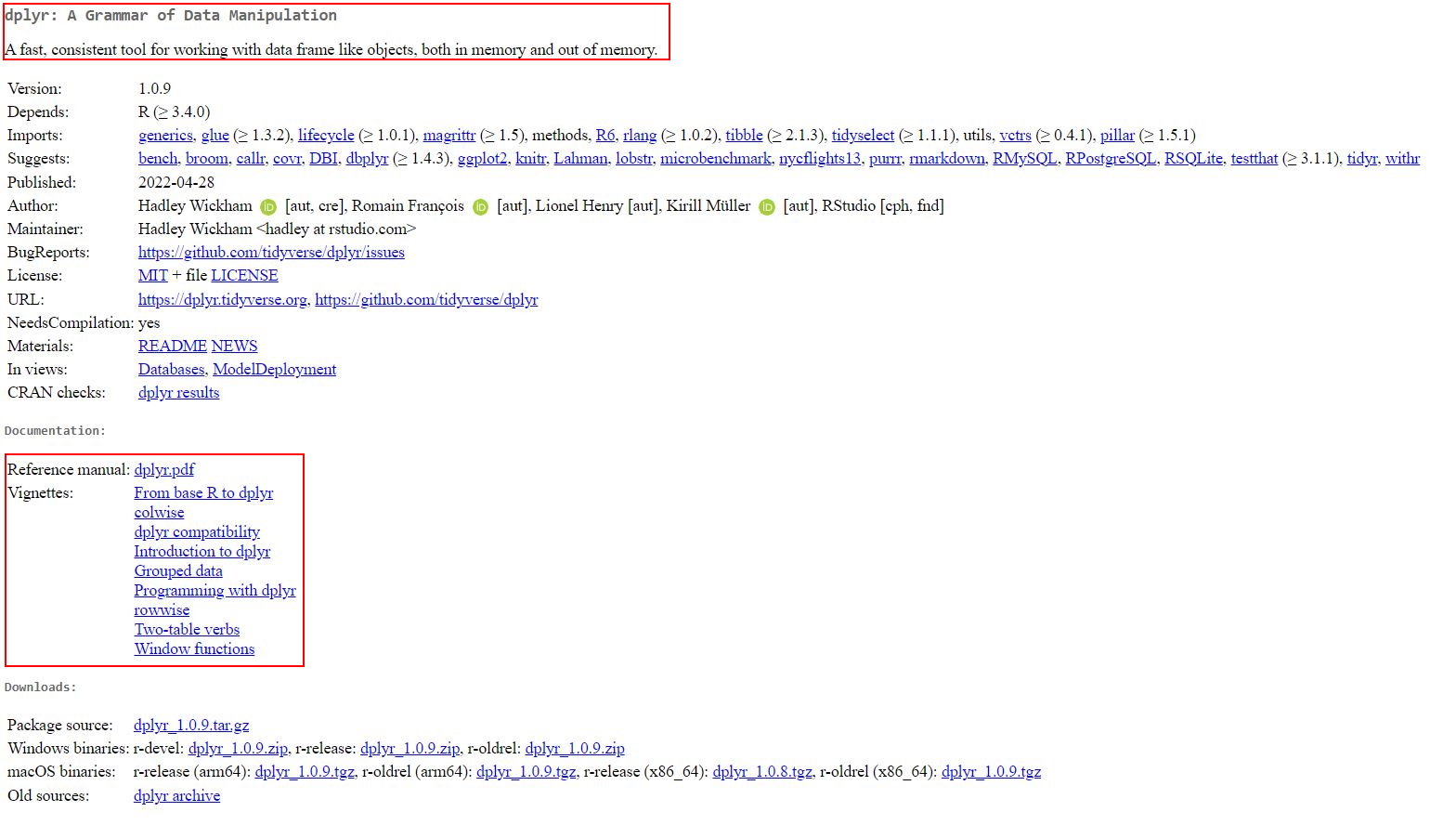 The easiest way to finding these manuals/vignettes is Google: Simply google CRAN dplyr, for instance, and you’ll be guided to the following website: