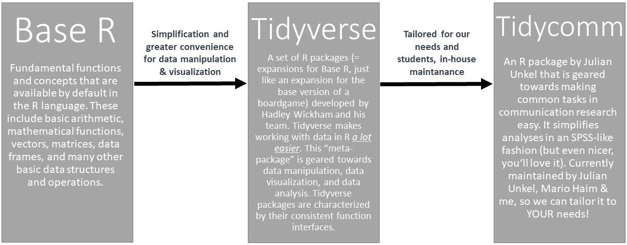 Our approach to teaching BA students is to use the tidycomm package developed by Julian Unkel. It uses the tidyverse style of coding, but incorporates many convenience functions for communication researchers, such as calculating ICR tests (e.g., Krippendorff’s alpha or Fretwurst’s lotus). Julian, Mario Haim, and I are currently enhancing the package to greatly simplify data analysis for our students as compared to using SPSS. For example, with each significance test tidycomm will automatically provide students suitable graphical visualizations. To convince yourself of the ease of working with tidycomm, please refer to the following section: [Using R is easy!]